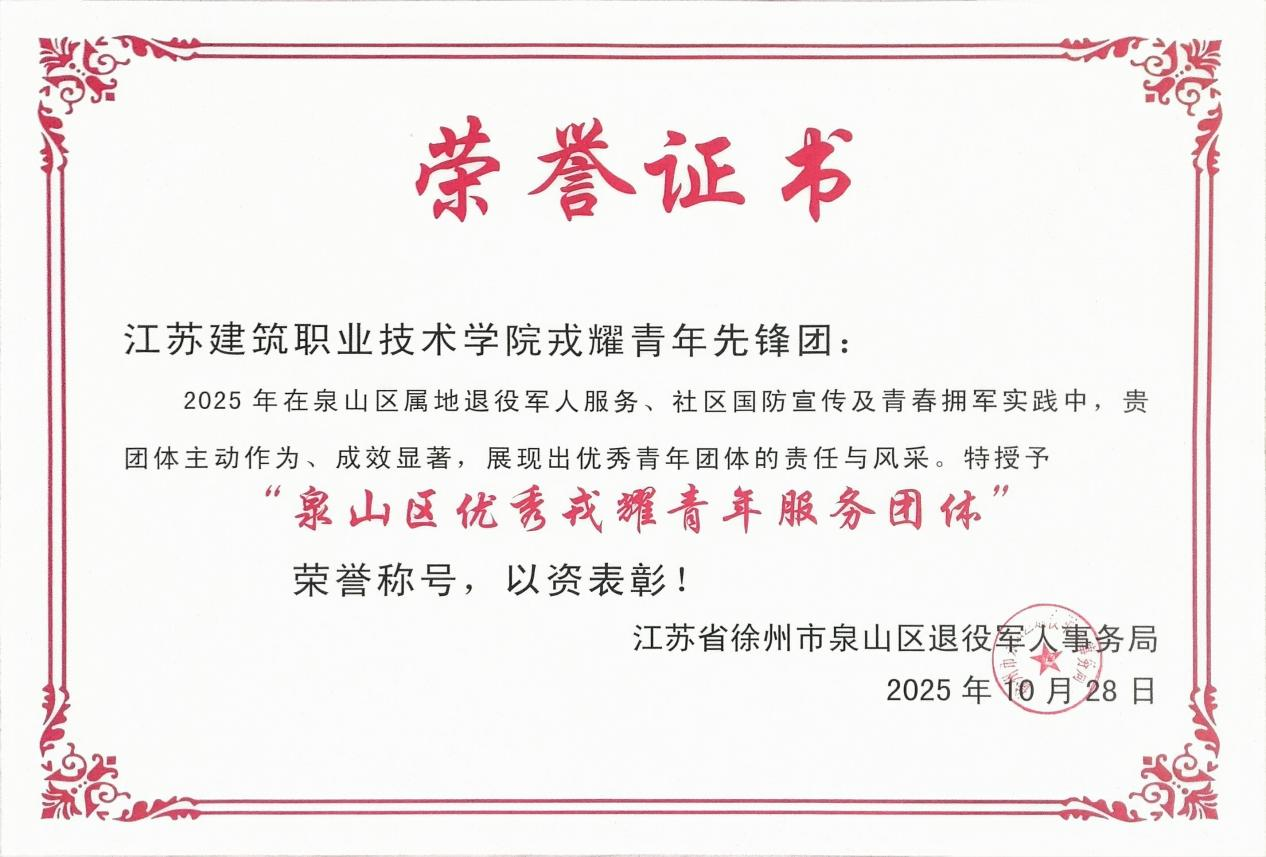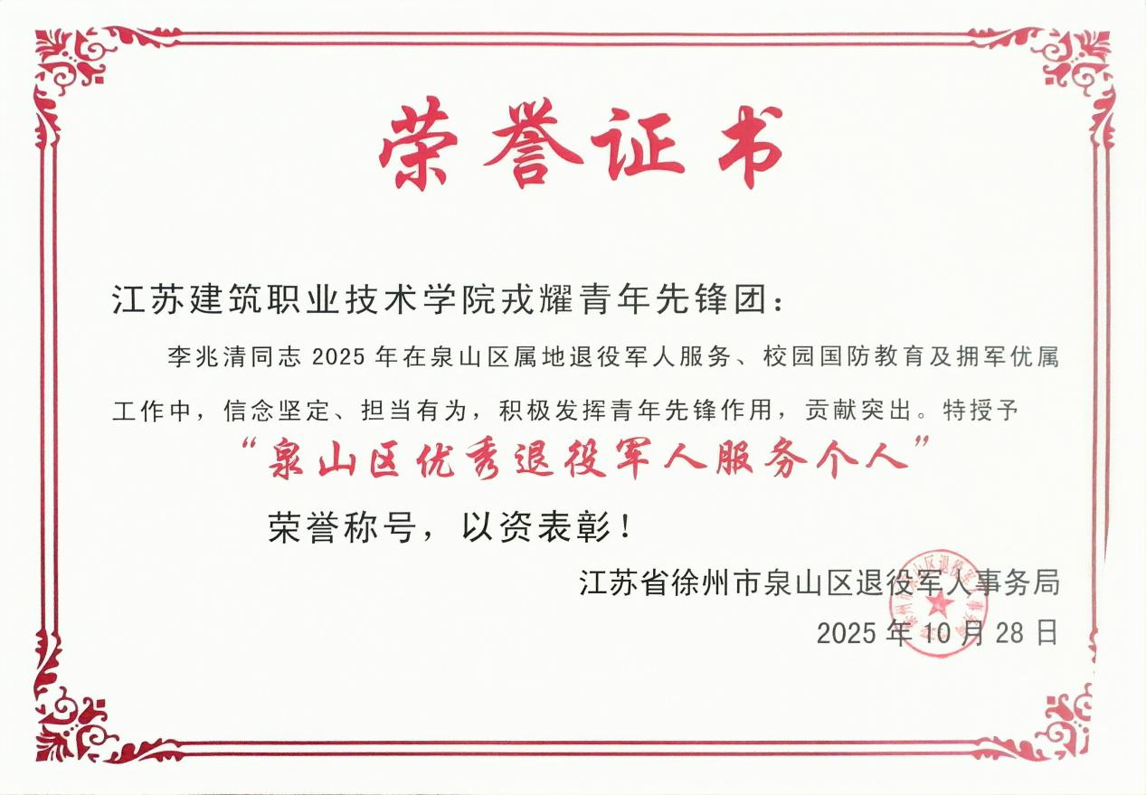 近日,徐州市泉山区退役军人事务局发布表彰决定,我校戎耀青年先锋团被授予“泉山区优秀戎耀青年服务团体”称号,该团主席李兆清获评“泉山区优秀退役军人服务个人”,以嘉奖其在2025年属地退役军人服务、国防教育宣传及拥军优属工作中的突出贡献。