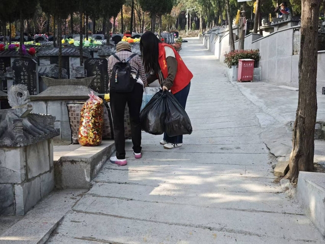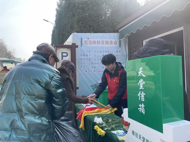 面对传统祭祀中可能存在的安全隐患与环境问题,志愿者们化身“文明新风”的传播者。他们积极向市民推广“鲜花祭扫”“丝带寄思”及“天堂信箱”等低碳祭奠方式,耐心地向前来祭扫的群众讲解传统焚烧习俗对环境的影响。